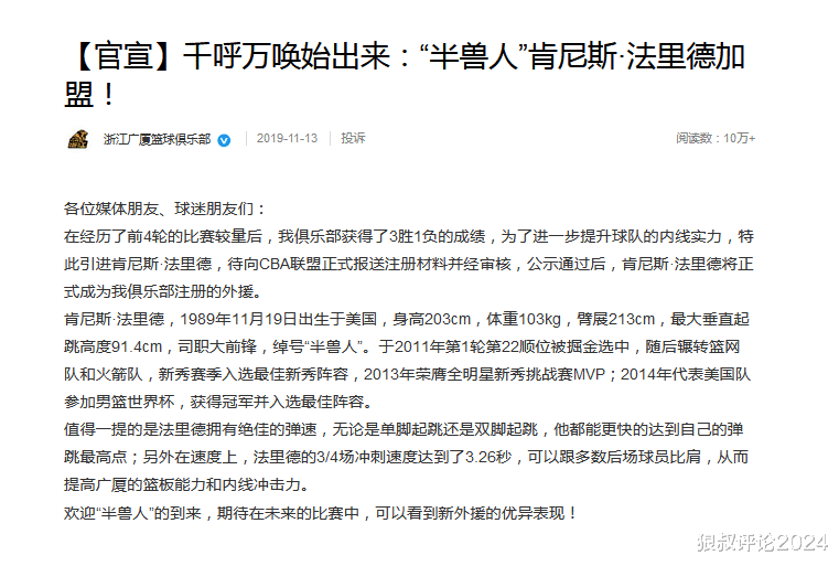 2019年11月13日,CBA广厦男篮官方宣布签下肯尼思·法里埃德引发外界的广泛关注,但仅仅打了7场比赛,广厦男篮就宣布裁掉法里埃德。